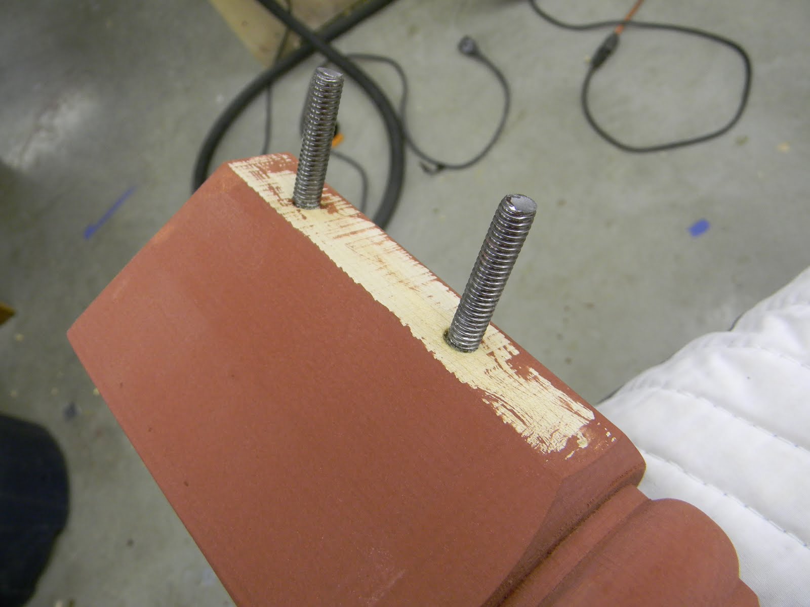 Which are basically a lag screw on one end and a threaded bolt (5/16 on these ones) on the other. I band sawed a flat, carefully marked the hole location, and used the drill press to drill the holes. A little wax, and I drove them in by double nutting them and using an impact driver with a 1/2" socket. Beats a wrench any day! You can see here how I plowed a couple dadoes to let in the piece that the leg bolts to. The angled piece is both screwed and glued in place. And then the bolts go thru and tighten up.