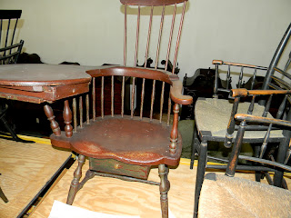 Here are some more attic pieces at the CHS (Conneticut Historical Museum). Here is a beautiful bowfront dresser. When I go to pick up my chair in September, I want to get measures of this dresser and the two C-arm chairs in my last blog. I like high boys and all the veneering but have no place for that furniture in my house.